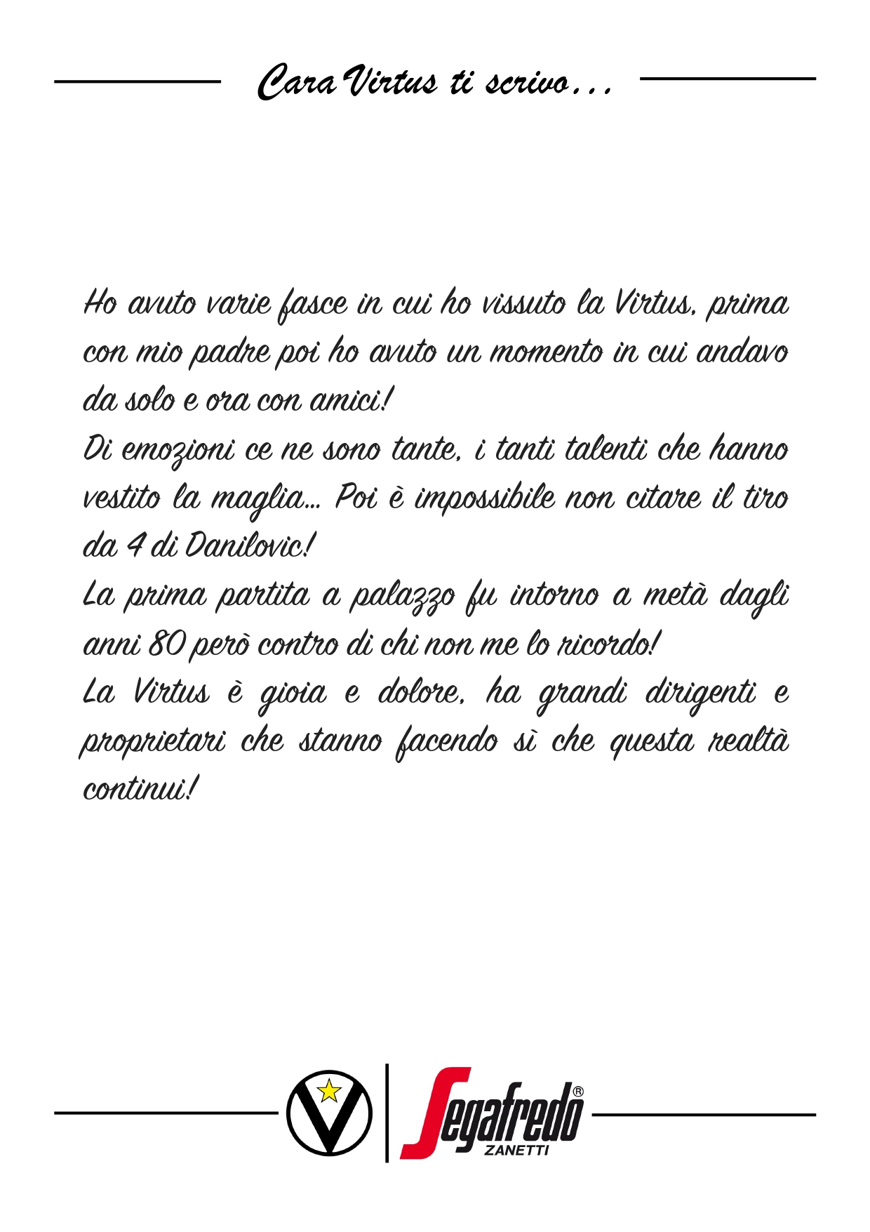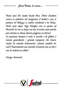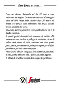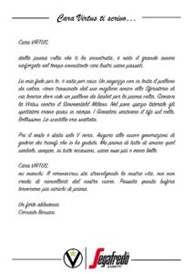 Ora vogliamo dare a voi la parola con l’iniziativa: Cara Virtus ti scrivo… una lettera aperta alla nostra Società, nella quale potrete dare libera voce al vostro cuore, alla vostra passione per lo sport e la Virtus.