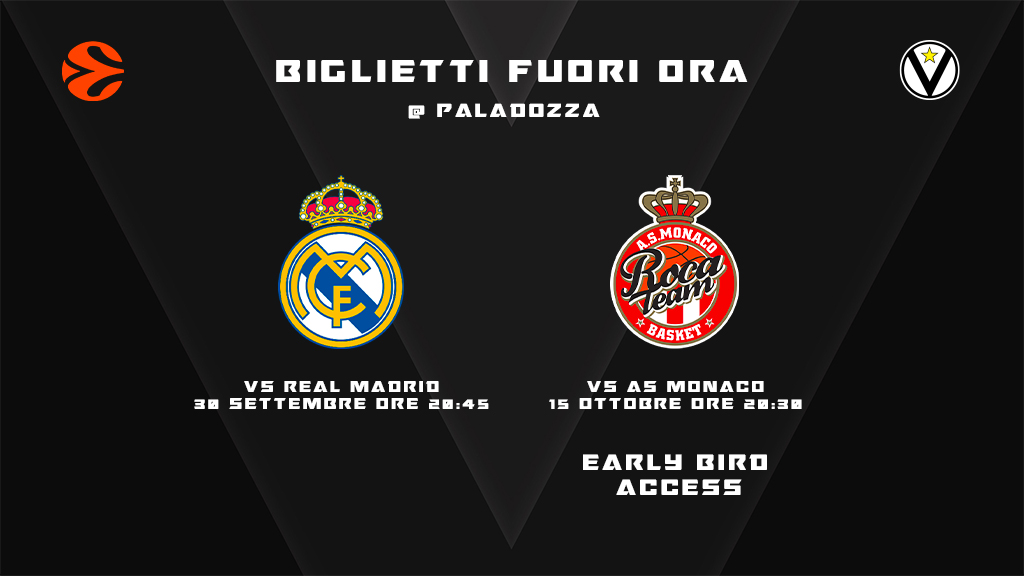 Aprirà domani alle 12.00 la biglietteria per le prime due sfide casalinghe di Eurolega al Paladozza: Virtus Bologna-Real Madrid, in programma martedì 30 settembre alle ore 20.45 e Virtus Bologna-AS Monaco, in programma mercoledì 15 ottobre alle ore 20.30.
