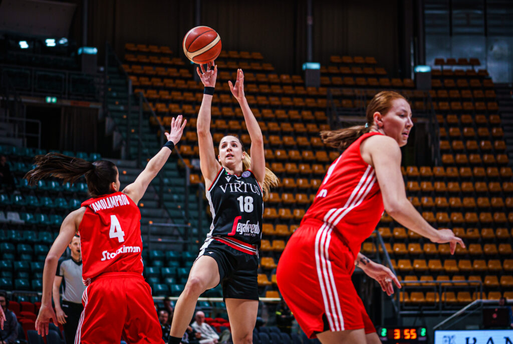 Avvio deciso delle bianconere che si portano velocemente in vantaggio con Dojkic e Rupert, a cui risponde subito Guestafson che rispetta i pronostici di essere tra le principali armi in mano alle greche. La Segafredo si difende con ordine e recupera palloni pesanti sfruttando la poca precisione delle ospiti, scappando sul 13-6 e costringendo le biancorosse ad un time-out per sistemare le idee. Olympiacos fatica a trovare con continuità il canestro, affidandosi quasi ed esclusivamente alle folate individuali di Gustafson e limitando Stamolamprou sugli esterni: le greche infatti si trovano molto velocemente con 5 falli di squadra e la difesa ne risente, non potendo mettere in campo la necessaria aggressività. Con Laksa e Rupert sugli scudi il primo quarto si chiude sul 26-16. Nel secondo parziale cresce molto la presenza fisica della Segafredo sotto canestro, complice una Andrè molto veloce a rollare sui pick’n’roll e a trovare quindi soluzioni di tiro ottimali. La capacità della Virtus di coinvolgere tutte le giocatrici in campo spalmando i punti: anche il gap tra le due squadre inizia ad ampliarsi, a favore di una Segafredo maggiormente concentrata in difesa rispetto alle avversarie. La differenza, fatta a rimbalzo e alla voce palle recuperate da parte della Virtus, porta il primo tempo a chiudersi sul 49-38.
