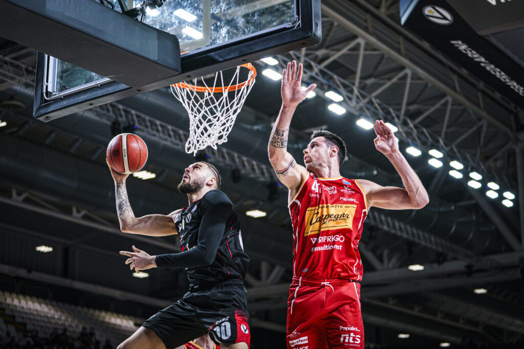 Difendere il titolo conquistato lo scorso 11 giugno, è con questo spirito che i Campioni d’Italia in carica della Virtus Segafredo Bologna iniziano oggi i loro playoff Scudetto affrontando la Carpegna Pesaro tra le mura amiche della Segafredo Arena.  Primi 5′ minuti che vedono la squadra di Coach Scariolo imporre energia e fisicità, Jaiteh e Shegelia lottano sotto le plance, Weems segna dall’arco e la difesa virtussina non lascia tempo di ragionare a Delfino e compagni (15-9), Pesaro risponde riportandosi a -1 ma il giocatore georgiano e Belinelli trovano le triple del nuovo +7 (21-14). Fine di primo quarto che viene messo nuovamente in disccusione dalla squadra marchigiana che piazza il break chiudendo dopo 10′ di gioco in svantaggio con il punteggio di 24 a 22. Secondo quarto equilibrato dove entrambe le squadre non riesconono a prendere il largo, Belinelli porta a +6 i suoi compagni ma Sanford dalla lunetta fa 2/3 e Tambone trova la conclusione dall’arco che riporta a contatto i suoi compagni (33-32) a meno di 5′ dall’intervallo lungo,sorpasso pesarese firmato ancora una volta da Sandford ma Tessitori riporta la Virtus in avanti appoggiando prima da due e poi trovando la tripla del +4 (38-34). La Segafredo piazza la strappata sul finire del primo tempo e proprio Belinelli, a pochi decimi dalla seconda sirena, mette il canestro del momentaneo +9, 45 a 36 dopo i primi 20′ di gioco. Inizio di secondo tempo che vede Pesaro reagire provando con Moretti e Sandford a recuperare lo svantaggio, la squadra di Coach Banchi ritorna a -2 e la panchina virtussina ferma il gioco sul puteggio di 53 a 51; Shengelia è costretto a lasciare il parquet di gioco per infortunio dopo 5′ dalla ripresa del gioco. Fase convulsa della gara complicata anche da qualche decisione non chiara della terna arbitrale che non trova assolutamente d’accordo il pubblico virtussino presente alla Segafredo Arena, Jaiteh, Belinelli e Sampson piazzano il break del 7 a 0 che vale il nuovo +9 e costringe la panchina ospite a chiamre il time out a 1′ e 14′ dalla fine (60-51). Delfino mette i primi punti della sua gara sul finire del terzo quarto ma è ancora una volta il capitano a trovare due punti impossibili proprio sul suono della terza sirena, punteggio di 62 a 54. Ultimo quarto che si apre con la tripla di Hackett, ma gli animi in campo si scaldano e viene fischiato un anitisportivo per parte (Sampson e Jones), controbreak di Pesaro che vale il -3 prima che Sampson possa segnare dalla media interrompendo la controffensiva, partita molto tesa ma Jaiteh e Weems, mettono tutti d’accordo schiacciando entrambi il +6 a 5′ dalla fine (71-65). Cordinier chiude il gioco da tre, Alibegovic riceve da Pajola e sotto le plance non sbaglia, la Carpegna prova a riportarsi a soli due possessi da Belinelli e compagni ma Sandford rimette tutto in discussione segnando la tripla del -3 a 1′ abbondante dal termine (78 – 75). Jaiteh segna, Lamb fa 1/2 mentre Pajola dalla lunetta è freddo e preciso (2/2), la Virtus Segafredo conquista così Gara-1 vincendo con il punteggio di 82 – 76.