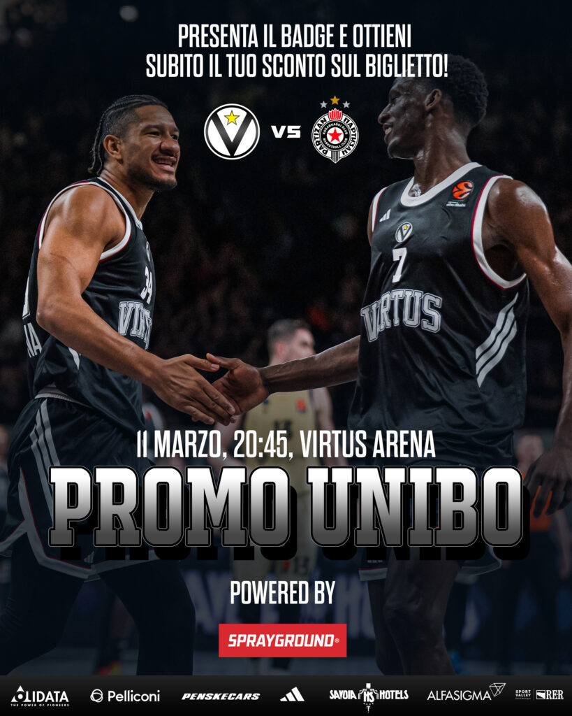 In occasione della prossima gara casalinga di Eurolega della Virtus Bologna alla Virtus Arena contro Partizan Belgrado, in programma mercoledì 11 marzo alle ore 20.45, è attiva la promozione UniBo che permette agli studenti e alle studentesse di acquistare il proprio biglietto al prezzo agevolato di 10€. Basterà presentare il badge presso uno dei rivenditori autorizzati VivaTicket, in Casa Virtus Alfasigma o in biglietteria il giorno della partita.