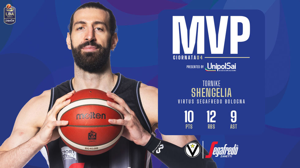 Inizio di stagione a livelli altissimi quello di Tornik’e Shengelia (Virtus Segafredo Bologna) che sta trascinando la sua squadra in entrambe le competizioni. Il lungo georgiano è stato premiato come miglior giocatore del quarto turno di campionato superando nei voti Kruize Pinkins (Givova Scafati Basket) e Langston Galloway (UNAHOTELS Reggio Emilia).